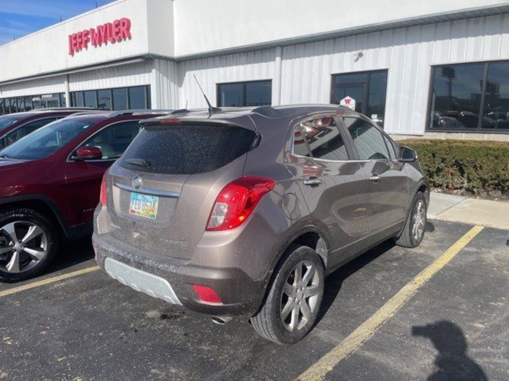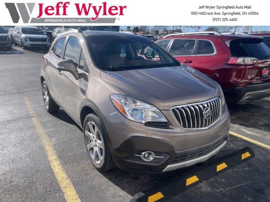 Jeff Wyler Springfield Auto Mall is excited to offer this wonderful 2014 Buick Encore Leather in Cocoa Silver Metallic. Well equipped with: 1SL Equipment Group (120-Volt Power Outlet, Auto-Dimming Inside Rear-View Mirror, Dual-Zone Automatic Climate Control, Front Fog Lamps, and Remote Vehicle Starter System), 18" Chromed Aluminum Wheels, 3.53 Final Drive Ratio, 4-Wheel Disc Brakes, 6 Speakers, ABS brakes, Air Conditioning, Alloy wheels, AM/FM radio: SiriusXM, Auto-dimming Rear-View mirror, Automatic temperature control, Brake assist, Bumpers: body-color, CD player, Compass, Delay-off headlights, Driver door bin, Driver vanity mirror, Driver's Seat Mounted Armrest, Dual front impact airbags, Dual front side impact airbags, Electronic Stability Control, Emergency communication system: OnStar Directions & Connections, Exterior Parking Camera Rear, Front anti-roll bar, Front Bucket Seats, Front dual zone A/C, Front fog lights, Front reading lights, Front wheel independent suspension, Fully automatic headlights, Heated door mirrors, Heated Driver & Front Passenger Seats, Heated front seats, Heated steering wheel, Illuminated entry, Knee airbag, Leather steering wheel, Leather-Appointed Seat Trim, Low tire pressure warning, Memory seat, Occupant sensing airbag, Outside temperature display, Overhead airbag, Panic alarm, Passenger door bin, Passenger vanity mirror, Power door mirrors, Power driver seat, Power passenger seat, Power steering, Power windows, Premium audio system: IntelliLink, Radio data system, Radio: AM/FM Audio System w/MP3 CD Player, Rear seat center armrest, Rear side impact airbag, Rear window defroster, Rear window wiper, Remote keyless entry, Ride & Handling Suspension, Roof rack: rails only, Security system, SiriusXM Satellite Radio, Speed control, Speed-sensing steering, Split folding rear seat, Spoiler, Steering wheel mounted audio controls, Tachometer, Telescoping steering wheel, Tilt steering wheel, Traction control, Trip computer, Turn signal indicator mirrors, Variably intermittent wipers, and Wheels: 18" Painted Cast Aluminum. Awards: * JD Power Initial Quality Study * 2014 KBB.com 5-Year Cost to Own Awards * 2014 KBB.com Brand Image Awards Reviews: * Those who subscribe to the axiom good things come in small packages will have their beliefs validated by the 2014 Buick Encore. Front-wheel drive (FWD) or all-wheel drive (AWD), a long list of available equipment, and an inviting interior design make this Buick the Cadillac of compact SUVS. Source: KBB.com * Quiet interior; great fuel economy; impressive list of tech and safety features. Source: EdmundsAsk about available certifications. Used vehicles 10 years of age or newer with less than 100,000 miles are eligible for the Wyler Assurance Program, but eligible vehicles must pass our reconditioning process and multi-point inspection. Provided the vehicle passes inspection, vehicles will be eligible for the 6 month/6,000 mile limited warranty. The 6 month/6,000 mile limited warranty is NOT available on AS-IS vehicles, wholesale vehicles, lease buyback/pass-thru vehicles or un-inspected vehicles. Note that this program can also apply to vehicles where the remaining factory coverage is less than 6 months or 6,000 miles. Please check the Federal Trade Commission (FTC) Buyers guide on the vehicle for full details as to whether or not warranty coverage may apply. Contact Dealer for additional details. The Wyler Assurance 6 month/6,000 Mile limited warranty ends 6 months from the date of the Retail Purchase Agreement (BUYERS ORDER) or when the vehicle's odometer registers 6,000 additional miles to the mileage listed on the BUYERS ORDER, whichever comes first. Your Deductible - The warranty holder on your contract pays the first $100 of each covered repair.