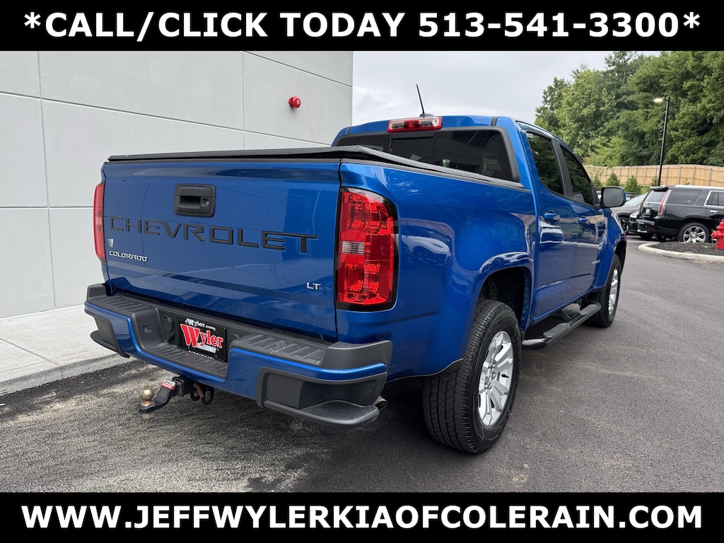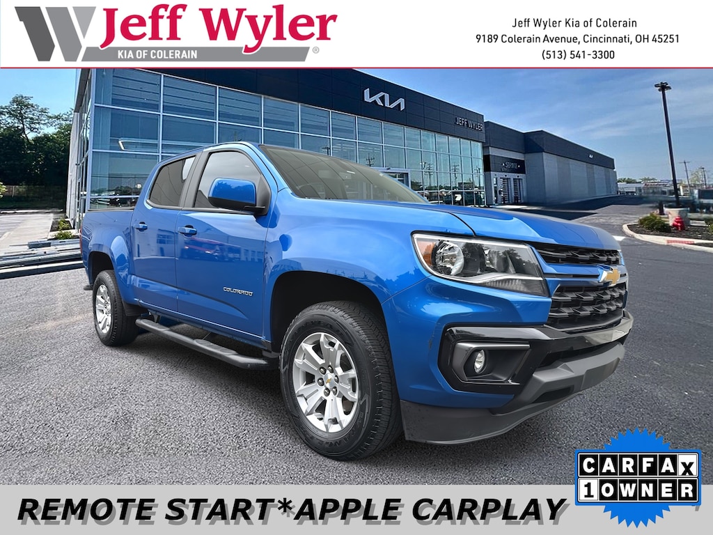 Jeff Wyler Kia of Colerain is very proud to offer this handsome 2022 Chevrolet Colorado LT in Bright Blue Metallic. LT Convenience Package (Front Fog Lamps, Manual Rear-Sliding Window, Rear-Window Electric Defogger, and Remote Vehicle Starter System), Preferred Equipment Group 2LT (Enhanced Driver Instrument Information Display and Rear Vision Camera), 4-Wheel Disc Brakes, 4.10 Rear Axle Ratio, 6 Speakers, 6-Speaker Audio System Feature, ABS brakes, Air Conditioning, Alloy wheels, AM/FM radio: SiriusXM, Apple CarPlay/Android Auto, Auto-dimming Rear-View mirror, Automatic Locking Rear Differential, Bumpers: body-color, Cloth Seat Trim, Compass, Delay-off headlights, Driver 6-Way Power Seat Adjuster, Driver door bin, Driver vanity mirror, Dual front impact airbags, Dual front side impact airbags, Electronic Stability Control, Exterior Parking Camera Rear, Front anti-roll bar, Front Bucket Seats, Front Center Armrest, Front reading lights, Front wheel independent suspension, Fully automatic headlights, Illuminated entry, Low tire pressure warning, Occupant sensing airbag, Outside Heated Power-Adjustable Body-Color Mirrors, Outside temperature display, Overhead airbag, Overhead console, Panic alarm, Passenger door bin, Passenger vanity mirror, Power door mirrors, Power driver seat, Power steering, Power windows, Premium audio system: Chevrolet Infotainment 3, Radio data system, Radio: Chevrolet Infotainment 3 System, Rear reading lights, Rear seat center armrest, Rear step bumper, Remote keyless entry, Security system, SiriusXM Radio, Speed control, Speed-sensing steering, Steering wheel mounted audio controls, Tachometer, Telescoping steering wheel, Tilt steering wheel, Traction control, Trip computer, Variably intermittent wipers, and Wheels: 17" x 8" Blade Silver Metallic Cast Alloy Our PRE-OWNED vehicles are put through a rigorous 167- POINT QUALITY ASSURANCE INSPECTION along with an average amount of over $1,400.00 SPENT to recondition each vehicle so we can be sure to deliver you the highest quality vehicle like you deserve! ***ONLINE PRICE DOES NOT INCLUDE WYLER FAMILY FIRST PACKAGE***