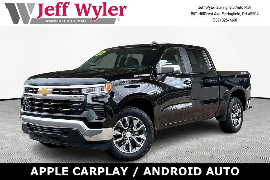 Jeff Wyler Springfield Auto Mall is pumped up to offer this superb 2023 Chevrolet Silverado 1500 LT in Black. Well equipped with: Convenience Package (10-Way Power Driver Seat w/Lumbar, 120-Volt Bed Mounted Power Outlet, 120-Volt Instrument Panel Power Outlet, Dual Rear USB Ports (Charge Only), Dual-Zone Automatic Climate Control, Heated Driver & Front Outboard Passenger Seats, Heated Steering Wheel, Keyless Open & Start, and Wrapped Steering Wheel), High Capacity Suspension Package, Standard Suspension Package, Trailering Package (Hitch Guidance), 12.3" Multicolor Reconfigurable Digital Display, 3.42 Rear Axle Ratio, 4-Wheel Disc Brakes, 40/20/40 Front Split-Bench Seat, 6 Speakers, 6-Speaker Audio System, ABS brakes, Air Conditioning, All-Star Edition, Alloy wheels, AM/FM radio: SiriusXM with 360L, Apple CarPlay/Android Auto, Auto High-beam Headlights, Auto-Locking Rear Differential, Automatic Emergency Braking, Automatic temperature control, Bluetooth® For Phone, Brake assist, Bumpers: chrome, Chevrolet Connected Access Capable, Chrome Mirror Caps, Cloth Seat Trim, Color-Keyed Carpeting Floor Covering, Compass, Deep-Tinted Glass, Delay-off headlights, Driver door bin, Driver vanity mirror, Dual front impact airbags, Dual front side impact airbags, Electric Rear-Window Defogger, Electrical Steering Column Lock, Electronic Cruise Control, Electronic Stability Control, Following Distance Indicator, Forward Collision Alert, Front anti-roll bar, Front Center Armrest w/Storage, Front dual zone A/C, Front Frame-Mounted Black Recovery Hooks, Front Pedestrian Braking, Front reading lights, Front wheel independent suspension, Fully automatic headlights, HD Rear Vision Camera, Heated door mirrors, Heated front seats, Heated steering wheel, Illuminated entry, IntelliBeam Automatic High Beam On/Off, Lane Keep Assist w/Lane Departure Warning, LED Cargo Area Lighting, Low tire pressure warning, Not Equipped w/Steering Column Lock, Occupant sensing airbag, OnStar & Chevrolet Connected Services Capable, Outside temperature display, Overhead airbag, Overhead console, Panic alarm, Passenger door bin, Passenger vanity mirror, Power door mirrors, Power driver seat, Power Front Windows w/Driver Express Up/Down, Power Front Windows w/Passenger Express Down, Power Rear Windows w/Express Down, Power steering, Power windows, Premium audio system: Chevrolet Infotainment 3 Premium, Radio data system, Radio: Chevrolet Infotainment 3 Premium System, Rear 60/40 Folding Bench Seat (Folds Up), Rear reading lights, Rear step bumper, Rear window defroster, Remote keyless entry, Remote Vehicle Starter System, Security system, SiriusXM w/360L, Speed control, Speed-sensing steering, Split folding rear seat, Steering Wheel Audio Controls, Steering wheel mounted audio controls, Tachometer, Telescoping steering wheel, Theft Deterrent System (Unauthorized Entry), Tilt steering wheel, Traction control, Trip computer, Variably intermittent wipers, Voltmeter, Wheels: 18" x 8.5" Bright Silver Painted Aluminum, Wheels: 20" x 9" Painted Aluminum, Wi-Fi Hot Spot Capable, and Wireless Phone Projection. Ask about available certifications. Used vehicles 10 years of age or newer with less than 100,000 miles are eligible for the Wyler Assurance Program, but eligible vehicles must pass our reconditioning process and multi-point inspection. Provided the vehicle passes inspection, vehicles will be eligible for the 6 month/6,000 mile limited warranty. The 6 month/6,000 mile limited warranty is NOT available on AS-IS vehicles, wholesale vehicles, lease buyback/pass-thru vehicles or un-inspected vehicles. Note that this program can also apply to vehicles where the remaining factory coverage is less than 6 months or 6,000 miles. Please check the Federal Trade Commission (FTC) Buyers guide on the vehicle for full details as to whether or not warranty coverage may apply. Contact Dealer for additional details. The Wyler Assurance 6 month/6,000 Mile limited warranty ends 6 months from th