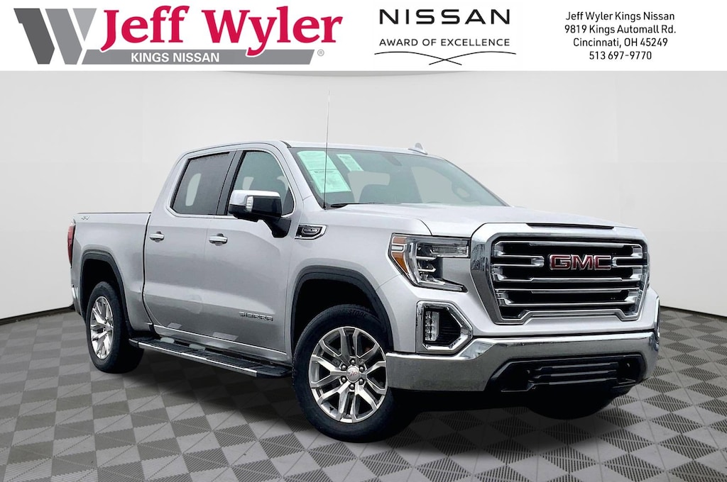 Jeff Wyler Kings Nissan is excited to offer this handsome 2019 GMC Sierra 1500 SLT in Quicksilver Metallic. Well equipped with: Preferred Equipment Group 4SA (12-Volt Rear Auxiliary Power Outlet, 120-Volt Bed Mounted Power Outlet, 120-Volt Instrument Panel Power Outlet, 170 Amp Alternator, Auxiliary External Transmission Oil Cooler, Chrome Grille, Color-Keyed Carpeting Floor Covering, Compass, Deep-Tinted Glass, Electric Rear-Window Defogger, Electrical Lock Control Steering Column, Front Frame-Mounted Black Recovery Hooks, GMC 4G LTE, GMC Connected Access, HD Radio, Heated Driver & Front Passenger Seating, Heavy-Duty Rear Locking Differential, Hitch Guidance, Hitch Guidance w/Hitch View, In-Vehicle Trailering App, Integrated Trailer Brake Controller, Keyless Open & Start, LED Cargo Area Lighting, Manual Tilt-Wheel & Telescoping Steering Column, OnStar & GMC Connected Services Capable, Power Door Locks, Power Front Passenger Windows w/Express Up/Down, Power Front Windows w/Driver Express Up/Down, Power Rear Windows w/Express Down, Rear Dual USB Charging-Only Ports, Rear Wheelhouse Liners, Remote Vehicle Starter System, Steering Wheel Audio Controls, and Theft Deterrent System (Unauthorized Entry)), SLT Convenience Package (2 USB Ports, 2 USB Ports (1st Row), Floor Mounted Console, Front Bucket Seats, Heated 2nd Row Outboard Seats, Power Sliding Rear Window w/Rear Defogger, Universal Home Remote, and Ventilated Driver & Front Passenger Seats), SLT Premium Package (Chrome Assist Steps), Trailering Package, 8-Speed Automatic, 4WD, Jet Black Leather, 10-Way Power Driver Seat Adjuster w/Lumbar, 10-Way Power Passenger Seat Adjuster w/Lumbar, 20" x 9" Polished Aluminum Wheels, 3.23 Rear Axle Ratio, 4-Wheel Disc Brakes, 6 Speakers, 6-Speaker Audio System Feature, ABS brakes, Air Conditioning, Alloy wheels, AM/FM radio: SiriusXM, Apple CarPlay/Android Auto, Auto-dimming door mirrors, Auto-dimming Rear-View mirror, Automatic temperature control, Brake assist, Bumpers: chrome, Delay-off headlights, Driver door bin, Driver Memory, Driver vanity mirror, Dual front impact airbags, Dual front side impact airbags, Electronic Stability Control, Front 40/20/40 Split-Bench Seat, Front anti-roll bar, Front Center Armrest w/Storage, Front dual zone A/C, Front fog lights, Front License Plate Kit, Front reading lights, Front wheel independent suspension, Fully automatic headlights, Heated door mirrors, Heated front seats, Heated steering wheel, Heavy Duty Suspension, Illuminated entry, Low tire pressure warning, Memory seat, Occupant sensing airbag, Outside temperature display, Overhead airbag, Overhead console, Panic alarm, Passenger door bin, Passenger vanity mirror, Perforated Leather-Appointed Seat Trim, Power door mirrors, Power driver seat, Power passenger seat, Power steering, Power windows, Premium audio system: GMC Infotainment System, Radio data system, Radio: Premium GMC Infotainment Sys w/Multi-Touch, Rear reading lights, Rear seat center armrest, Rear step bumper, Rear window defroster, Remote keyless entry, Security system, SiriusXM Radio, Speed control, Speed-sensing steering, Split folding rear seat, Spray-On Pickup Bed Liner w/GMC Logo, Steering wheel mounted audio controls, Tachometer, Telescoping steering wheel, Tilt steering wheel, Traction control, Trip computer, Variably intermittent wipers, Voltmeter, and Wheels: 18" x 8.5" 6-Spoke Machined Aluminum.Ask about available certifications.