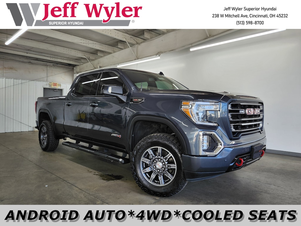 Jeff Wyler Superior Hyundai is honored to offer this wonderful 2020 GMC Sierra 1500 AT4 in Satin Steel Metallic. Well equipped with: Trailering Package, 10-Speed Automatic, 4WD, Dark Walnut/Slate Leather, 10-Way Power Driver Seat Adjuster w/Lumbar, 10-Way Power Passenger Seat Adjuster w/Lumbar, 12-Volt Rear Auxiliary Power Outlet, 120-Volt Bed Mounted Power Outlet, 120-Volt Instrument Panel Power Outlet, 170 Amp Alternator, 18" x 8.5" Machined Aluminum Wheels, 2 USB Ports, 2 USB Ports (1st Row), 3.23 Rear Axle Ratio, 4-Wheel Disc Brakes, 4.2" Diagonal Color Display Driver Info Center, 4G LTE Wi-Fi Hotspot Capable, 6 Speakers, 6-Speaker Audio System Feature, ABS brakes, Air Conditioning, All-Weather Floor Liners w/AT4 Logo (LPO), Alloy wheels, AM/FM radio: SiriusXM with 360L, Apple CarPlay/Android Auto, Auto-dimming door mirrors, Auto-dimming Rear-View mirror, Automatic temperature control, Auxiliary External Transmission Oil Cooler, Body-Color Surround Grille, Brake assist, Bumpers: body-color, Color-Keyed Carpeting Floor Covering, Compass, Deep-Tinted Glass, Delay-off headlights, Driver door bin, Driver Memory, Driver vanity mirror, Dual front impact airbags, Dual front side impact airbags, Electric Rear-Window Defogger, Electrical Lock Control Steering Column, Electronic Stability Control, Floor-Mounted Center Console, Front anti-roll bar, Front Bucket Seats, Front Center Armrest, Front dual zone A/C, Front fog lights, Front reading lights, Front wheel independent suspension, Fully automatic headlights, GMC Connected Access Capable, HD Radio, HD Rear Vision Camera, Heated 2nd Row Outboard Seats, Heated door mirrors, Heated Driver & Front Outboard Passenger Seating, Heated front seats, Heated rear seats, Heated steering wheel, Heavy-Duty Rear Locking Differential, High Gloss Black Mirror Caps, High-Capacity Air Filter, Hill Descent Control, Hitch Guidance, Hitch Guidance w/Hitch View, Illuminated entry, In-Vehicle Trailering App, Integrated Trailer Brake Controller, Keyless Open & Start, LED Cargo Area Lighting, Low tire pressure warning, Manual Tilt-Wheel & Telescoping Steering Column, Memory seat, Occupant sensing airbag, Off-Road Suspension, OnStar & GMC Connected Services Capable, Outside temperature display, Overhead airbag, Overhead console, Panic alarm, Passenger door bin, Passenger vanity mirror, Perforated Leather-Appointed Front Seat Trim, Power Door Locks, Power door mirrors, Power driver seat, Power Front Passenger Windows w/Express Up/Down, Power Front Windows w/Driver Express Up/Down, Power passenger seat, Power Rear Windows w/Express Down, Power steering, Power windows, Premium audio system: GMC Infotainment System, ProGrade Trailering System, Radio data system, Radio: Premium GMC Infotainment Sys w/Multi-Touch, Rear Dual USB Charging-Only Ports, Rear reading lights, Rear seat center armrest, Rear step bumper, Rear Wheelhouse Liners, Rear window defroster, Red Recovery Hooks, Remote keyless entry, Remote Vehicle Starter System, Security system, SiriusXM w/360L, Speed control, Speed-sensing steering, Split folding rear seat, Spray-On Pickup Bed Liner w/AT4 Logo, Steering Wheel Audio Controls, Steering wheel mounted audio controls, Tachometer, Telescoping steering wheel, Theft Deterrent System (Unauthorized Entry), Tilt steering wheel, Traction control, Trip computer, Variably intermittent wipers, Ventilated Driver & Front Passenger Seats, Ventilated front seats, and Voltmeter. Clean CARFAX. This sales price excludes tax, title, and dealer fees. While every reasonable effort is made to ensure the accuracy of this information, we are not responsible for any errors or omissions contained on these pages. Used vehicles 10 years of age or newer with less than 100,000 miles are eligible for the Wyler Assurance Program, but eligible vehicles must pass our reconditioning process and multi-point inspection. Provided the vehicle passes inspection, vehicles will be eligible for the 6 month/6,000 mile limited warranty. The 6