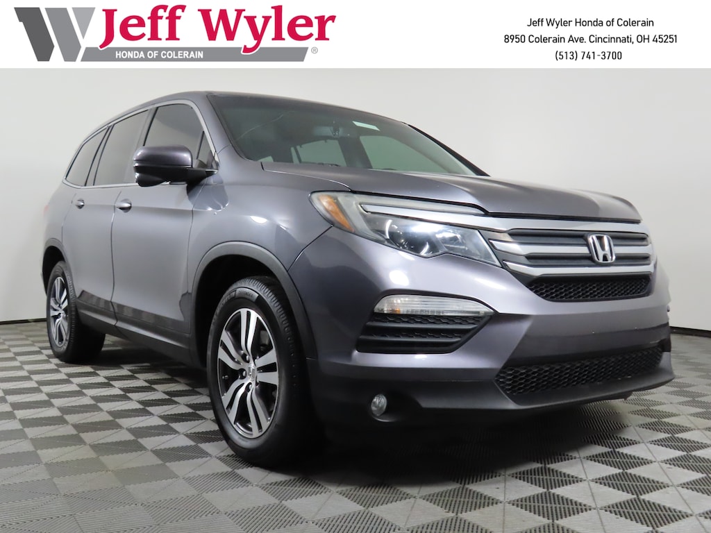 Jeff Wyler Honda of Colerain is pumped up to offer this outstanding 2016 Honda Pilot EX-L in Modern Steel Metallic. Well equipped with: 18" Alloy Wheels, 3rd row seats: split-bench, 4-Wheel Disc Brakes, 4.25 Axle Ratio, 7 Speakers, A/V remote, ABS brakes, Air Conditioning, Alloy wheels, AM/FM radio: SiriusXM, Auto-dimming Rear-View mirror, Automatic temperature control, Brake assist, Bumpers: body-color, Compass, Delay-off headlights, Driver door bin, Driver vanity mirror, Dual front impact airbags, Dual front side impact airbags, Electronic Stability Control, Emergency communication system: HondaLink Assist, Exterior Parking Camera Rear, Four wheel independent suspension, Front anti-roll bar, Front Bucket Seats, Front Center Armrest, Front dual zone A/C, Front fog lights, Front reading lights, Fully automatic headlights, Garage door transmitter: HomeLink, Headphones, Heated door mirrors, Heated Front Bucket Seats, Heated front seats, Illuminated entry, Leather Shift Knob, Leather-Trimmed Seats, Low tire pressure warning, Occupant sensing airbag, Outside temperature display, Overhead airbag, Overhead console, Panic alarm, Passenger door bin, Passenger vanity mirror, Power door mirrors, Power driver seat, Power Liftgate, Power moonroof, Power passenger seat, Power steering, Power windows, Radio data system, Radio: AM/FM Audio System, Rear air conditioning, Rear anti-roll bar, Rear audio controls, Rear reading lights, Rear seat center armrest, Rear window defroster, Rear window wiper, Remote keyless entry, Security system, SiriusXM Radio, Speed control, Speed-sensing steering, Speed-Sensitive Wipers, Split folding rear seat, Spoiler, Steering wheel mounted audio controls, Tachometer, Telescoping steering wheel, Tilt steering wheel, Traction control, Trip computer, and Variably intermittent wipers.