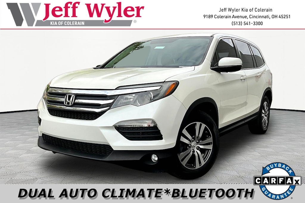 Jeff Wyler Kia of Colerain is very proud to offer this outstanding 2018 Honda Pilot EX in White Diamond Pearl. 18" Alloy Wheels, 3rd row seats: split-bench, 4-Wheel Disc Brakes, 4.25 Axle Ratio, 7 Speakers, ABS brakes, Air Conditioning, Alloy wheels, AM/FM radio: SiriusXM, Apple CarPlay/Android Auto, Automatic temperature control, Brake assist, Bumpers: body-color, Cloth Seat Trim, Compass, Delay-off headlights, Driver door bin, Driver vanity mirror, Dual front impact airbags, Dual front side impact airbags, Electronic Stability Control, Exterior Parking Camera Rear, Four wheel independent suspension, Front anti-roll bar, Front Bucket Seats, Front Center Armrest, Front dual zone A/C, Front fog lights, Front reading lights, Fully automatic headlights, Garage door transmitter: HomeLink, Illuminated entry, Low tire pressure warning, Occupant sensing airbag, Outside temperature display, Overhead airbag, Overhead console, Panic alarm, Passenger door bin, Passenger vanity mirror, Power door mirrors, Power driver seat, Power steering, Power windows, Radio data system, Radio: AM/FM Audio System, Rear air conditioning, Rear anti-roll bar, Rear reading lights, Rear seat center armrest, Rear window defroster, Rear window wiper, Remote keyless entry, Security system, SiriusXM Radio, Speed control, Speed-sensing steering, Speed-Sensitive Wipers, Split folding rear seat, Spoiler, Steering wheel mounted audio controls, Tachometer, Telescoping steering wheel, Tilt steering wheel, Traction control, Trip computer, and Variably intermittent wipers Our PRE-OWNED vehicles are put through a rigorous 167- POINT QUALITY ASSURANCE INSPECTION along with an average amount of over $1,400.00 SPENT to recondition each vehicle so we can be sure to deliver you the highest quality vehicle like you deserve! ***ONLINE PRICE DOES NOT INCLUDE WYLER FAMILY FIRST PACKAGE***