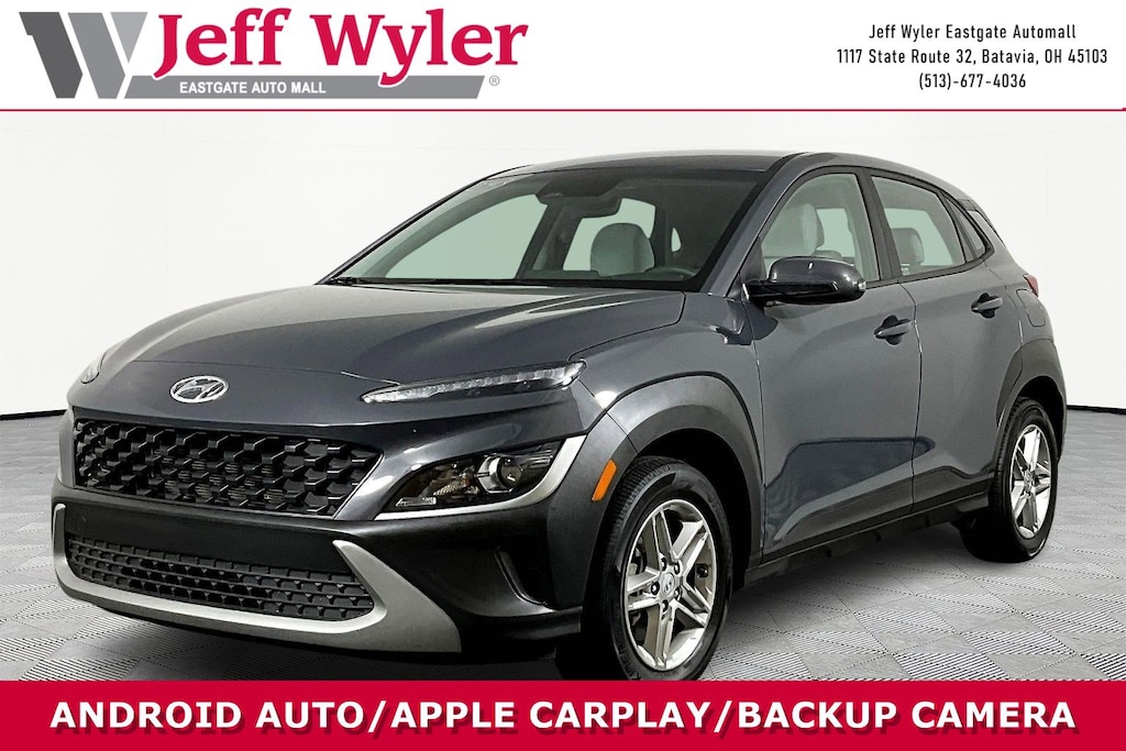 Jeff Wyler Eastgate Auto Mall is proud to offer this fantastic 2023 Hyundai Kona SE in Ecotronic Gray. Well equipped with: Option Group 01, 16" x 6.5J Alloy Wheels, 4-Wheel Disc Brakes, 5.715 Axle Ratio, 6 Speakers, ABS brakes, Air Conditioning, Alloy wheels, AM/FM radio, Apple CarPlay & Android Auto, Brake assist, Bumpers: body-color, Cargo Net, Cargo Tray, Carpeted Floor Mats, Cloth Seat Trim, Delay-off headlights, Driver door bin, Driver vanity mirror, Dual front impact airbags, Dual front side impact airbags, Electronic Stability Control, Exterior Parking Camera Rear, Four wheel independent suspension, Front anti-roll bar, Front Bucket Seats, Front Center Armrest, Front reading lights, Fully automatic headlights, Heated door mirrors, Illuminated entry, Low tire pressure warning, Occupant sensing airbag, Outside temperature display, Overhead airbag, Overhead console, Panic alarm, Passenger door bin, Passenger vanity mirror, Power door mirrors, Power steering, Power windows, Radio: AM/FM Audio System, Rear anti-roll bar, Rear seat center armrest, Rear window defroster, Rear window wiper, Remote keyless entry, Security system, Speed control, Speed-sensing steering, Split folding rear seat, Spoiler, Steering wheel mounted audio controls, Tachometer, Telescoping steering wheel, Tilt steering wheel, Traction control, Trip computer, Turn signal indicator mirrors, Variably intermittent wipers, and Wheel Locks. CARFAX One-Owner. Clean CARFAX. Ask about available certifications. Used vehicles 10 years of age or newer with less than 100,000 miles are eligible for the Wyler Assurance Program, but eligible vehicles must pass our reconditioning process and multi-point inspection. Provided the vehicle passes inspection, vehicles will be eligible for the 6 month/6,000 mile limited warranty. The 6 month/6,000 mile limited warranty is NOT available on AS-IS vehicles, wholesale vehicles, lease buyback/pass-thru vehicles or un-inspected vehicles. Note that this program can also apply to vehicles where the remaining factory coverage is less than 6 months or 6,000 miles. Please check the Federal Trade Commission (FTC) Buyers guide on the vehicle for full details as to whether or not warranty coverage may apply. Contact Dealer for additional details. The Wyler Assurance 6 month/6,000 Mile limited warranty ends 6 months from the date of the Retail Purchase Agreement (BUYERS ORDER) or when the vehicle's odometer registers 6,000 additional miles to the mileage listed on the BUYERS ORDER, whichever comes first. Your Deductible - The warranty holder on your contract pays the first $100 of each covered repair.