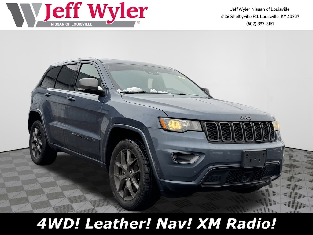 Jeff Wyler Nissan of Louisville is excited to offer this gorgeous 2021 Jeep Grand Cherokee 80th Anniversary Edition in Pacific Blue Clearcoat. ** HOME DELIVERY OPTIONS! ** Quick Order Package 2BK 80th (Adaptive Cruise Control w/Stop, Advanced Brake Assist, Berber Floor Mats w/80th Anniversary Tag, Black Roof Molding, Body Color Claddings, Body Color Door Handles, Body Color Shark Fin Antenna, Dark Day Light Opening Moldings, Dark Headlamp Bezel Finish, Dark Lens Taillamps, Front Accent/Body Color Fascia, Full Speed FWD Collision Warn Plus, Granite Crystal Exterior Accents, Granite Crystal Exterior Badging, Granite Crystal Exterior Mirror Caps, Granite Crystal/Black Grille, Jeep 80th Anniversary Badges, Jeep 80th Anniversary Edition, Lane Departure Warning Plus, Leather Trimmed Bucket Seats (JY), LT. Tungsten Interior Accent Stitching, Parallel & Perp Park Assist w/Stop, Piano Black/Anod. Gunmetal Interior Accents, Rain Sensitive Windshield Wipers, Rear Accent/Body Color Fascia, and Wheels: 20" x 8.0" Granite Crystal Aluminum), 4WD, 1-Year SiriusXM Guardian Trial, 230MM Rear Axle, 3.45 Rear Axle Ratio, 4-Wheel Disc Brakes, 4G LTE Wi-Fi Hot Spot, 6 Speakers, 8.4" Touchscreen Display, ABS brakes, Air Conditioning, Alloy wheels, AM/FM radio: SiriusXM, Anti-whiplash front head restraints, Apple CarPlay, Apple CarPlay/Android Auto, Audio memory, Auto-dimming door mirrors, Auto-dimming Rear-View mirror, Automatic temperature control, Brake assist, Bumpers: body-color, Compass, Delay-off headlights, Driver door bin, Driver vanity mirror, Dual front impact airbags, Dual front side impact airbags, Electronic Stability Control, Emergency communication system: SiriusXM Guardian, Four wheel independent suspension, Front anti-roll bar, Front Bucket Seats, Front Center Armrest w/Storage, Front dual zone A/C, Front fog lights, Front License Plate Bracket, Front reading lights, Fully automatic headlights, Garage door transmitter, Google Android Auto, GPS Antenna Input, GPS Navigation, HD Radio, Heated door mirrors, Heated front seats, Heated steering wheel, Illuminated entry, Integrated Voice Command w/Bluetooth, Knee airbag, Leather Shift Knob, Leather Trimmed Bucket Seats, Low tire pressure warning, Memory seat, Navigation System, Normal Duty Suspension, Occupant sensing airbag, Outside temperature display, Overhead airbag, Overhead console, Panic alarm, ParkView Rear Back-Up Camera, Passenger door bin, Passenger vanity mirror, Power door mirrors, Power driver seat, Power Liftgate, Power moonroof, Power passenger seat, Power steering, Power windows, Radio data system, Radio: Uconnect 4C Nav w/8.4" Display, Rear anti-roll bar, Rear reading lights, Rear seat center armrest, Rear window defroster, Rear window wiper, Remote keyless entry, Roof rack: rails only, Security system, SiriusXM Satellite Radio, SiriusXM Traffic Plus, SiriusXM Travel Link, Speed control, Speed-sensing steering, Speed-Sensitive Wipers, Split folding rear seat, Spoiler, Steering wheel mounted audio controls, Tachometer, Telescoping steering wheel, Tilt steering wheel, Traction control, Trip computer, Turn signal indicator mirrors, Variably intermittent wipers, Voltmeter, and Wheels: 18" x 8.0" Tech Gray Diamond Cut Our PRE-OWNED vehicles are put through a rigorous 167- POINT QUALITY ASSURANCE INSPECTION along with an average amount of over $1,400.00 SPENT to recondition each vehicle so we can be sure to deliver you the highest quality vehicle like you deserve! ***ONLINE PRICE DOES NOT INCLUDE WYLER FAMILY FIRST PACKAGE*** Stop by 4136 Shelbyville Road to see for yourself, or give us a call @ 502-897-3151 to schedule your test drive! 4WD.