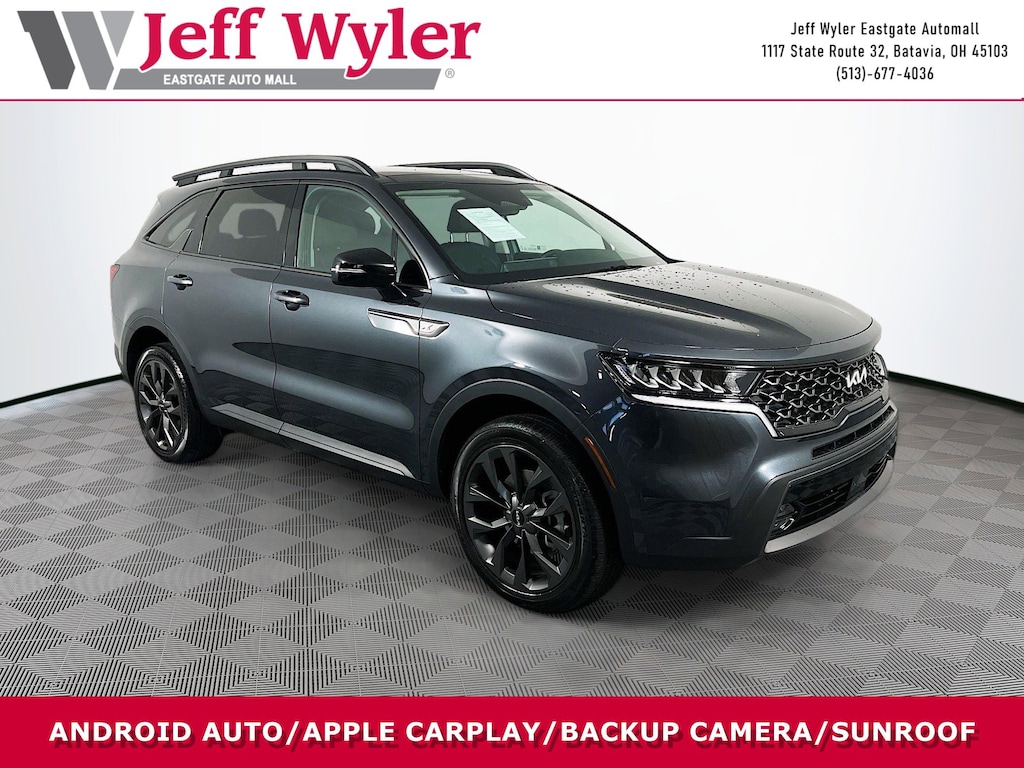 Jeff Wyler Eastgate Auto Mall is excited to offer this terrific 2023 Kia Sorento X-Line EX in Gravity Gray. Well equipped with: 3.316 Axle Ratio, 3rd row seats: split-bench, 4-Wheel Disc Brakes, 6 Speakers, ABS brakes, Air Conditioning, Alloy wheels, AM/FM radio: SiriusXM, Apple CarPlay & Android Auto, Auto High-beam Headlights, Auto-dimming Rear-View mirror, Automatic temperature control, Brake assist, Bumpers: body-color, Carpet Floor Mats, Delay-off headlights, Driver door bin, Driver vanity mirror, Dual front impact airbags, Dual front side impact airbags, Electronic Stability Control, Emergency communication system, Exterior Parking Camera Rear, Four wheel independent suspension, Front anti-roll bar, Front Bucket Seats, Front Center Armrest, Front dual zone A/C, Front fog lights, Front reading lights, Fully automatic headlights, Heated door mirrors, Heated Front Bucket Seats, Heated front seats, Illuminated entry, Knee airbag, Leather Shift Knob, Leather steering wheel, Low tire pressure warning, Navigation System, Occupant sensing airbag, Outside temperature display, Overhead airbag, Overhead console, Panic alarm, Passenger door bin, Passenger vanity mirror, Power door mirrors, Power driver seat, Power Liftgate, Power moonroof, Power passenger seat, Power steering, Power windows, Radio data system, Radio: AM/FM Audio System, Rear air conditioning, Rear anti-roll bar, Rear reading lights, Rear window defroster, Rear window wiper, Remote keyless entry, Roof rack: rails only, Security system, Smart Key w/ Push Button and Remote Start, Speed control, Speed-sensing steering, Split folding rear seat, Spoiler, Steering wheel mounted audio controls, SynTex Artificial Leather Seat Trim, Tachometer, Telescoping steering wheel, Tilt steering wheel, Traction control, Trip computer, Turn signal indicator mirrors, Variably intermittent wipers, and Wheels: 8.5J x 20" Matte Gray Alloy. Clean CARFAX. Ask about available certifications. Used vehicles 10 years of age or newer with less than 100,000 miles are eligible for the Wyler Assurance Program, but eligible vehicles must pass our reconditioning process and multi-point inspection. Provided the vehicle passes inspection, vehicles will be eligible for the 6 month/6,000 mile limited warranty. The 6 month/6,000 mile limited warranty is NOT available on AS-IS vehicles, wholesale vehicles, lease buyback/pass-thru vehicles or un-inspected vehicles. Note that this program can also apply to vehicles where the remaining factory coverage is less than 6 months or 6,000 miles. Please check the Federal Trade Commission (FTC) Buyers guide on the vehicle for full details as to whether or not warranty coverage may apply. Contact Dealer for additional details. The Wyler Assurance 6 month/6,000 Mile limited warranty ends 6 months from the date of the Retail Purchase Agreement (BUYERS ORDER) or when the vehicle's odometer registers 6,000 additional miles to the mileage listed on the BUYERS ORDER, whichever comes first. Your Deductible - The warranty holder on your contract pays the first $100 of each covered repair.