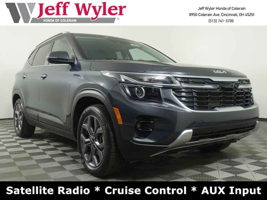 Jeff Wyler Honda of Colerain is very proud to offer this handsome 2024 Kia Seltos S in Gravity Gray. Well equipped with: Navy Interior Color Package, 4-Wheel Disc Brakes, 6 Speakers, 6.052 Axle Ratio, ABS brakes, Air Conditioning, Alloy wheels, AM/FM radio: SiriusXM, Apple CarPlay & Android Auto, Auto High-beam Headlights, Automatic temperature control, Brake assist, Bumpers: body-color, Carpet Floor Mats, Cloth & Sofino Premium Leatherette Seat Trim, Delay-off headlights, Driver door bin, Driver vanity mirror, Dual front impact airbags, Dual front side impact airbags, Electronic Stability Control, Emergency communication system: 911 Connect, Exterior Parking Camera Rear, Front anti-roll bar, Front Bucket Seats, Front Center Armrest, Front fog lights, Front reading lights, Front wheel independent suspension, Fully automatic headlights, Heated door mirrors, Illuminated entry, Leather Shift Knob, Leather steering wheel, Low tire pressure warning, Navigation System, Occupant sensing airbag, Outside temperature display, Overhead airbag, Overhead console, Panic alarm, Passenger door bin, Passenger vanity mirror, Power door mirrors, Power steering, Power windows, Radio: AM/FM/HD/Satellite Display System, Rear seat center armrest, Rear window defroster, Rear window wiper, Remote keyless entry, Security system, Speed control, Speed-sensing steering, Split folding rear seat, Spoiler, Steering wheel mounted audio controls, Tachometer, Telescoping steering wheel, Tilt steering wheel, Traction control, Trip computer, Turn signal indicator mirrors, Variably intermittent wipers, and Wheels: 17" Alloy w/Dark Gray Finish.