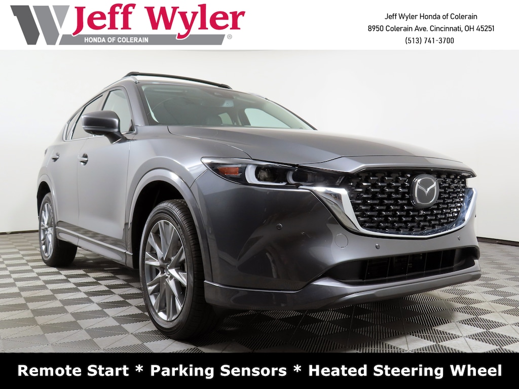 Jeff Wyler Honda of Colerain is delighted to offer this beautiful-looking 2025 Mazda CX-5 2.5 S Premium Plus Package in Machine Gray Metallic. Well equipped with: Roof Rails & Cross Bars Package, 10 Speakers, 4-Wheel Disc Brakes, ABS brakes, Air Conditioning, Alloy wheels, AM/FM radio: SiriusXM, AppLink/Apple CarPlay and Android Auto, Auto High-beam Headlights, Auto-dimming Rear-View mirror, Automatic temperature control, Brake assist, Bumpers: body-color, Delay-off headlights, Driver door bin, Driver vanity mirror, Dual front impact airbags, Dual front side impact airbags, E911 Automatic Emergency Notification, Electronic Stability Control, Emergency communication system: MAZDA CONNECT, Four wheel independent suspension, Front anti-roll bar, Front Bucket Seats, Front Center Armrest w/Storage, Front dual zone A/C, Front reading lights, Fully automatic headlights, Garage door transmitter: HomeLink, Heads-Up Display, Heated door mirrors, Heated front seats, Heated rear seats, Heated steering wheel, Heated/Ventilated Front Bucket Seats, Illuminated entry, Infotainment System Voice Command, Leather Seat Trim, Leather Shift Knob, Leather steering wheel, Low tire pressure warning, Machine Gray Metallic Paint, Memory seat, Multifunction Commander Control, Occupant sensing airbag, Outside temperature display, Overhead airbag, Overhead console, Pandora, Panic alarm, Passenger door bin, Passenger vanity mirror, Power door mirrors, Power driver seat, Power Liftgate, Power moonroof, Power passenger seat, Power steering, Power windows, Radio Broadcast Data System Program Information, Radio data system, Radio: AM/FM/HD Audio System, Rain sensing wipers, Rear anti-roll bar, Rear Bumper Guard, Rear reading lights, Rear seat center armrest, Rear window defroster, Rear window wiper, Remote keyless entry, Retractable Cargo Cover, SMS Text Msg Audio Delivery & Reply, Speed control, Speed-sensing steering, Split folding rear seat, Spoiler, Steering wheel mounted audio controls, Tachometer, Telescoping steering wheel, Tilt steering wheel, Traction control, Trip computer, Turn signal indicator mirrors, Variably intermittent wipers, Ventilated front seats, and Wheels: 19" x 7J Aluminum Alloy.