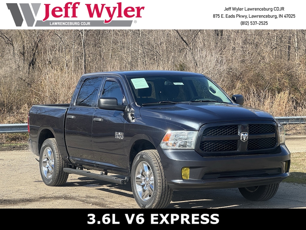 Jeff Wyler Chrysler Dodge Jeep of Lawrenceburg is very proud to offer this outstanding 2018 Ram 1500 Express in Maximum Steel Metallic Clearcoat. Popular Equipment Group (1-Yr SiriusXM Radio Service, 40/20/40 Split Bench Seat, Cloth 40/20/40 Bench Seat, For More Info, Call 800-643-2112, Front Armrest w/3 Cupholders, Manual Adjust Seats, No Satellite Coverage w/HI/AK/PR/VI/GU, Rear Folding Seat, Remote Keyless Entry w/All-Secure, SiriusXM Satellite Radio, and Storage Tray), Quick Order Package 22J Express (17" x 7" Aluminum Wheels, Body Color Front Fascia, Body Color Grille, Body Color Rear Bumper w/Step Pads, Carpet Floor Covering, Center Hub, Delete Class IV Receiver Hitch, Delete Spray In Bedliner, Front Floor Mats, Front Fog Lamps, Ram 1500 Express, and Rear Floor Mats), 17" x 7" Steel Wheels, 3.21 Rear Axle Ratio, 4-Wheel Disc Brakes, 6 Speakers, ABS brakes, Active Grille Shutters, Air Conditioning, AM/FM radio, Audio Jack Input for Mobile Devices, Auto-dimming Rear-View mirror, Black Exterior Mirrors, Brake assist, Delay-off headlights, Driver door bin, Dual front impact airbags, Dual front side impact airbags, Electronic Shift, Electronic Stability Control, Exterior Mirrors w/Heating Element, Front & Rear Rubber Floor Mats, Front anti-roll bar, Front Center Armrest, Front wheel independent suspension, Fully automatic headlights, Heated door mirrors, Heavy Duty Vinyl 40/20/40 Split Bench Seat, Low tire pressure warning, Media Hub (USB, AUX), Occupant sensing airbag, Overhead airbag, ParkView Rear Back-Up Camera, Passenger door bin, Power door mirrors, Power steering, Power windows, Radio data system, Radio: 3.0, Rear anti-roll bar, Rear seat center armrest, Rear step bumper, Remote USB Port, Speed control, Tachometer, Tilt steering wheel, Tip Start, Traction control, Variably intermittent wipers, Voltmeter, and Wheels: 20" x 8" Aluminum Chrome Clad Our PRE-OWNED vehicles are put through a rigorous 167- POINT QUALITY ASSURANCE INSPECTION along with an average amount of over $1,400.00 SPENT to recondition each vehicle so we can be sure to deliver you the highest quality vehicle like you deserve! ***ONLINE PRICE DOES NOT INCLUDE WYLER FAMILY FIRST PACKAGE*** Stop by 4136 Shelbyville Road to see for yourself, or give us a call @ 502-897-3151 to schedule your test drive! Ask about available certifications.