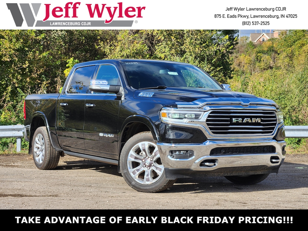 Jeff Wyler Chrysler Dodge Jeep of Lawrenceburg is pumped up to offer this outstanding 2019 Ram 1500 Laramie Longhorn in Diamond Black Crystal Pearlcoat. Longhorn Level 1 Equipment Group (1-Yr SiriusXM Guardian Trial, 12" Touchscreen Display, Apple CarPlay, Disassociated Touchscreen Display, Google Android Auto, GPS Antenna Input, GPS Navigation, HD Radio, Integrated Center Stack Radio, No Satellite Coverage w/HI/AK/PR/VI/GU, Radio: Uconnect 12 w/Navigation, SiriusXM Satellite Radio, SiriusXM Traffic Plus, SiriusXM Travel Link, and SiriusXM w/360L), Quick Order Package 25K Longhorn, #1 Seat Foam Cushion, 10 Speakers, 3 Rear Seat Head Restraints, 3.21 Rear Axle Ratio, 4 Way Front Headrests, 4-Wheel Disc Brakes, 48V Belt Starter Generator, ABS brakes, Adjustable pedals, Air Conditioning, Alloy wheels, AM/FM radio: SiriusXM, Apple CarPlay/Android Auto, Audio memory, Auto High-beam Headlights, Auto-dimming door mirrors, Auto-dimming Rear-View mirror, Automatic temperature control, Brake assist, Bucket Seats, Bumpers: chrome, Compass, Delay-off headlights, Dome Dual LED Reading Lamp, Driver door bin, Driver Seat Memory, Driver vanity mirror, Dual front impact airbags, Dual front side impact airbags, Dual-Pane Panoramic Sunroof, Electronic Stability Control, Emergency communication system: SiriusXM Guardian, Front anti-roll bar, Front Bucket Seats, Front Center Armrest w/Storage, Front dual zone A/C, Front fog lights, Front reading lights, Front Seat Back Map Pockets, Front wheel independent suspension, Fully automatic headlights, Garage door transmitter, Genuine wood console insert, Genuine wood dashboard insert, Genuine wood door panel insert, Heated door mirrors, Heated Front Seats, Heated front seats, Heated rear seats, Heated Second Row Seats, Heated Steering Wheel, Heated steering wheel, Illuminated entry, Leather steering wheel, LED Dome/Reading Lamp, Low tire pressure warning, Manufacturer's Statement of Origin, Memory seat, Navigation System, Occupant sensing airbag, Outside temperature display, Overhead airbag, Overhead console, Panic alarm, ParkView Rear Back-Up Camera, Passenger door bin, Passenger vanity mirror, Pedal memory, Power 4-Way Driver Lumbar Adjust, Power 4-Way Passenger Lumbar Adjust, Power 8-Way Driver & Passenger Seats, Power door mirrors, Power driver seat, Power passenger seat, Power steering, Power windows, Premium Leather Seats w/Filigree, Radio data system, Radio: Uconnect 4C Nav w/8.4" Display, Rain sensing wipers, Rear 60/40 Folding Split Recline Seat, Rear anti-roll bar, Rear seat center armrest, Rear step bumper, Rear window defroster, Remote CD player, Remote keyless entry, Security system, Speed control, Split folding rear seat, Steering wheel mounted audio controls, Tachometer, Telescoping steering wheel, Tilt steering wheel, Traction control, Trip computer, Turn signal indicator mirrors, Variably intermittent wipers, Ventilated Front Seats, Ventilated front seats, Voltmeter, and Wheels: 20" x 9" Aluminum Painted/Polished Our PRE-OWNED vehicles are put through a rigorous 167- POINT QUALITY ASSURANCE INSPECTION along with an average amount of over $1,400.00 SPENT to recondition each vehicle so we can be sure to deliver you the highest quality vehicle like you deserve! ***ONLINE PRICE DOES NOT INCLUDE WYLER FAMILY FIRST PACKAGE*** Stop by 4136 Shelbyville Road to see for yourself, or give us a call @ 502-897-3151 to schedule your test drive! Ask about available certifications.