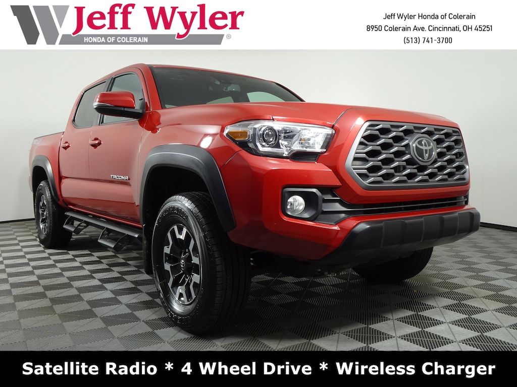 Jeff Wyler Honda of Colerain is very proud to offer this charming 2023 Toyota Tacoma TRD Off-Road in Barcelona Red Metallic. Well equipped with: ABS brakes, Alloy wheels, Electronic Stability Control, Front dual zone A/C, Heated door mirrors, Illuminated entry, Low tire pressure warning, Remote keyless entry, Traction control, 120V/400W Deck Mounted AC Power, 6 Speakers, Air Conditioning, AM/FM radio: SiriusXM, Anti-whiplash front head restraints, Apple CarPlay/Android Auto, Auto High-beam Headlights, Auto-dimming Rear-View mirror, Auto-Dimming Rearview Mirror w/HomeLink, Automatic temperature control, Black Overfenders, Brake assist, Bumpers: body-color, Driver door bin, Dual front impact airbags, Dual front side impact airbags, Emergency communication system: Safety Connect (1-year trial), Engine Immobilizer, Exterior Parking Camera Rear, Fabric Seat Trim, Front anti-roll bar, Front Bucket Seats, Front Center Armrest, Front fog lights, Front reading lights, Front Seats, Front wheel independent suspension, Garage door transmitter: HomeLink, Knee airbag, Leather Shift Knob, Occupant sensing airbag, Outside temperature display, Overhead airbag, Overhead console, Panic alarm, Passenger door bin, Power door mirrors, Power driver seat, Power Sliding Rear Window w/Privacy Glass, Power steering, Power windows, Radio: Audio, Rear step bumper, Security system, Speed control, Speed-sensing steering, Split folding rear seat, Steering wheel mounted audio controls, Tachometer, Telescoping steering wheel, Tilt steering wheel, Trip computer, Turn signal indicator mirrors, Variably intermittent wipers, and Wheels: 16" Machined Contrast Alloy.